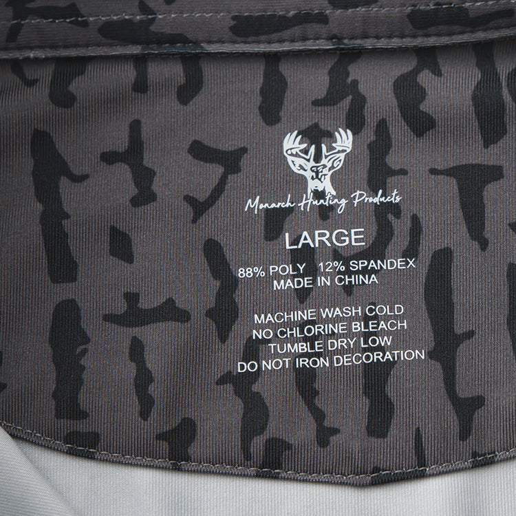 Finished in a modern camo pattern with subtle Monarch branding, this polo is an easy choice for hunting camps, travel days, casual outings, or everyday wear.