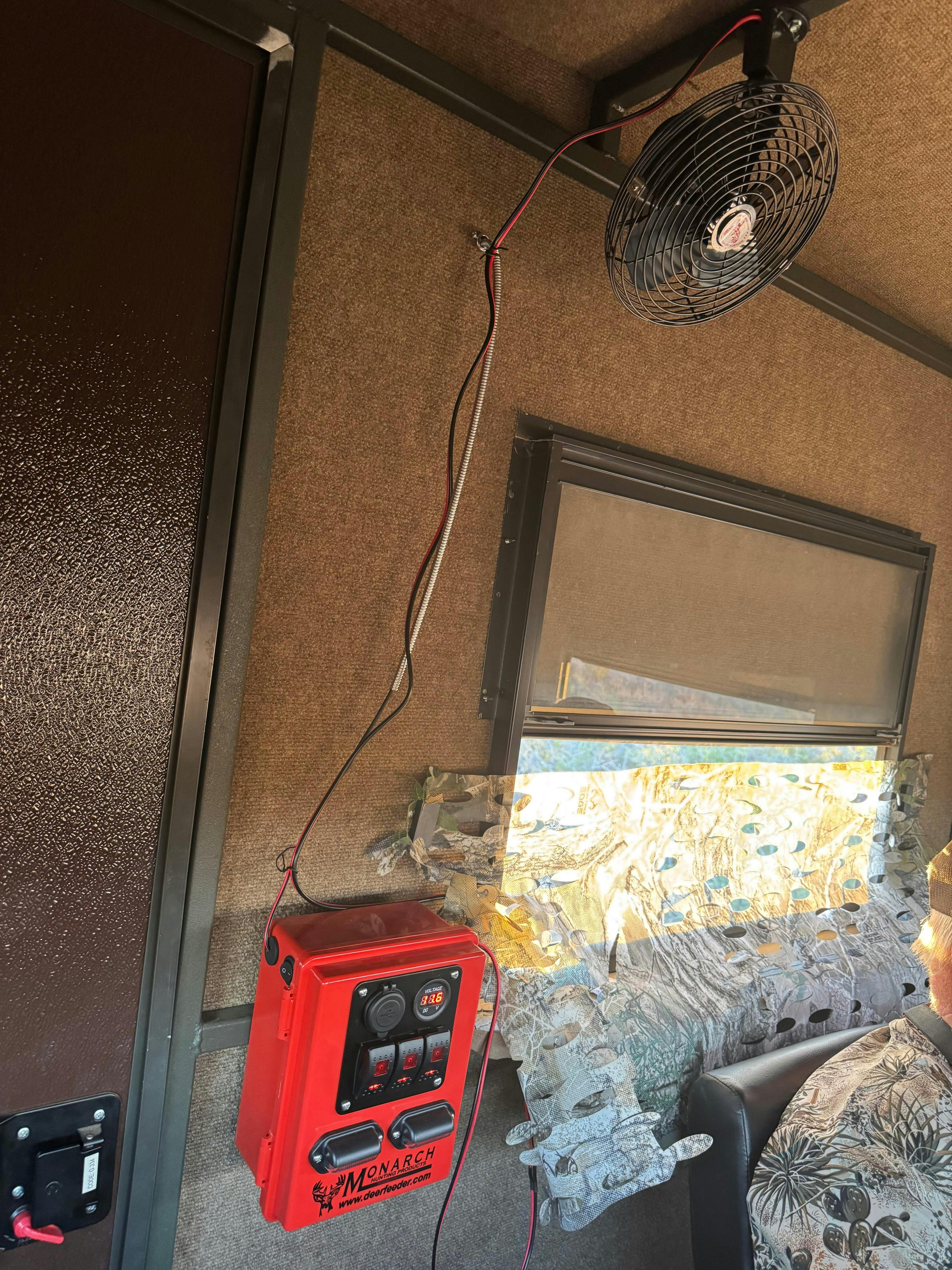 The Monarch Hunting Products Deer Blind Power Bank "The Charger" is a robust 12-volt system designed exclusively for use with 12V rechargeable batteries, with a recommended 12V 8AH battery for optimal performance. This comprehensive kit includes a durable ABS plastic weather-resistant enclosure that protects all components from the elements, ensuring reliable operation in outdoor conditions. It features a 12V solar panel to maintain battery charge, a 3-gang switch panel for convenient control of multiple devices, and USB charging ports to power your essential electronics. Additionally, the integrated voltmeter allows you to monitor battery status at a glance, while built-in LED lighting provides illumination inside your blind. SAE cable quick connects simplify setup and maintenance, making this power bank an expert choice for hunters seeking dependable, portable power in the field.